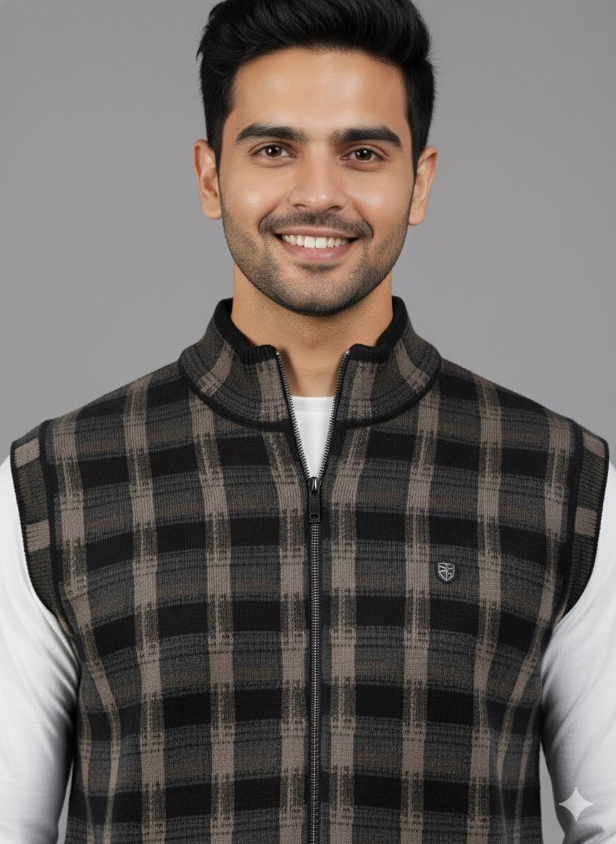 Upgrade your cold-weather layering with the Monte Carlo Men's Black & Grey Checkered Mock Neck Sleeveless Jacket. This knit vest combines a timeless plaid pattern with a modern, structured silhouette. Crafted from a warm and comfortable blend, it offers the perfect balance of casual style and essential insulation. The stand collar and full zip closure provide a sharp finish, ideal for a smart-casual look over a long-sleeve tee or shirt.